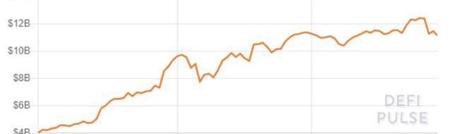 每周DEX交易量来源:DuneAnalytics尽管DeFi资产出现了大幅回调,交易量减少,但锁定的总价值仍接近创纪录的高位。DeFiPulse的数据显示,目前锁定的总价值为112亿美元,较10月25日的历史高点124.6亿美元略有下降。
