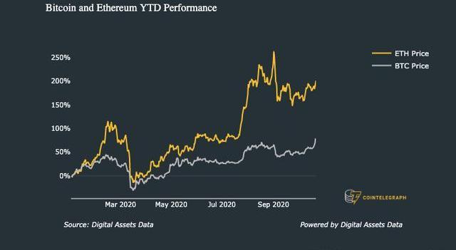 比特币和以太坊年初至今的表现来源:DigitalAssetsData今年迄今为止,比特币和以太坊的价格分别上涨了80.5%和217%。与此同时,PayPal上涨了99%,Square上涨了186%。另一方面,摩根大通和美国银行分别下跌了28%和32%。花旗集团的股价下跌了46%,富国银行的股价下跌了58%。