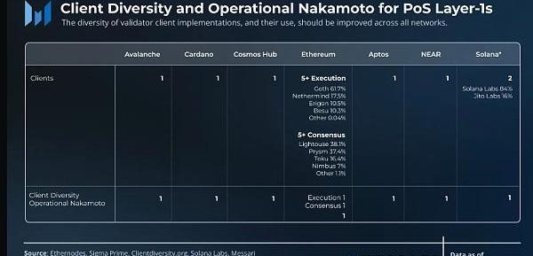 对Avalanche、Cardano、NEAR、Solana和Aptos,综合的“运营中本聪系数”将根据每个网络在软件客户端、节点托管基础设施和地理位置上的质押分布来计算。对于其他知名网络,将在适用的情况下进行一般性观察。运营中本聪系数作为代表运营去中心化的基本子系统的基本衡量标准,但需要进行额外分析以说明其他相互关联的变量。