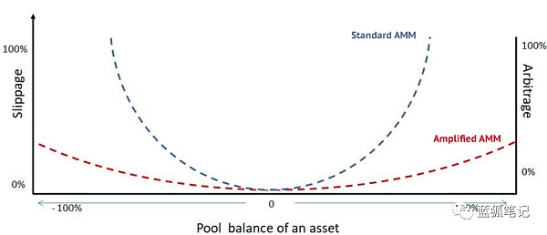 为了解决滑点过高问题,Bancor V2试图采用“流动性放大”的机制来改善。所谓的“流动性放大”的机制主要是通过改变AMM的定价曲线,实现在特定的价格范围内减少滑点。流动性放大的机制在稳定币和包装资产(如weth等)上应用较多,例如在Cuvre上。而这次Bancor要做的就是将它引入到波动性更大的代币池中。换句话说,Bancor V2将流动性聚焦于特定的价格范围内,而不是提供无限的做市价格范围。这不同于第一代AMM的“无限的”代币兑换。也就是,它不再跟之前的AMM一样,不会提供无限的做市价格范围。而为了平衡代币池,原先的AMM模式可能会出现天价兑换的价格。