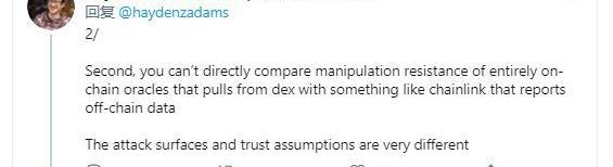 2.你不能在完全通过从去中心化交易所获得价格的链上预言机,与Chainlink这样通过汇报链下数据的预言机之间直接比较抗操控性。