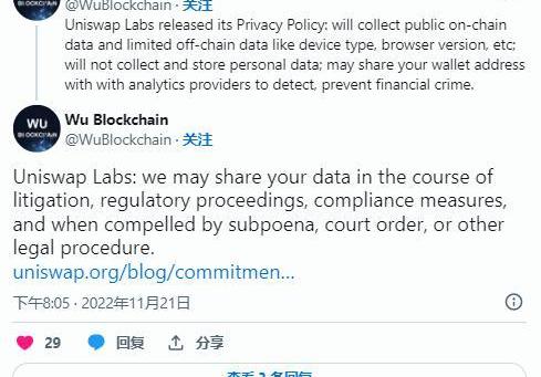 UniswapLabs发布了公司的隐私政策,向客户展示了他们保护数据和隐私的方式。