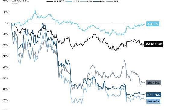 与BNB、ETH、S&P500指数和黄金相比,今年迄今跌幅ETH–69%、BNB-54%、美股S&P500指数-19%、黄金-1%。去年,该机构曾预测比特币将跑赢美股。
