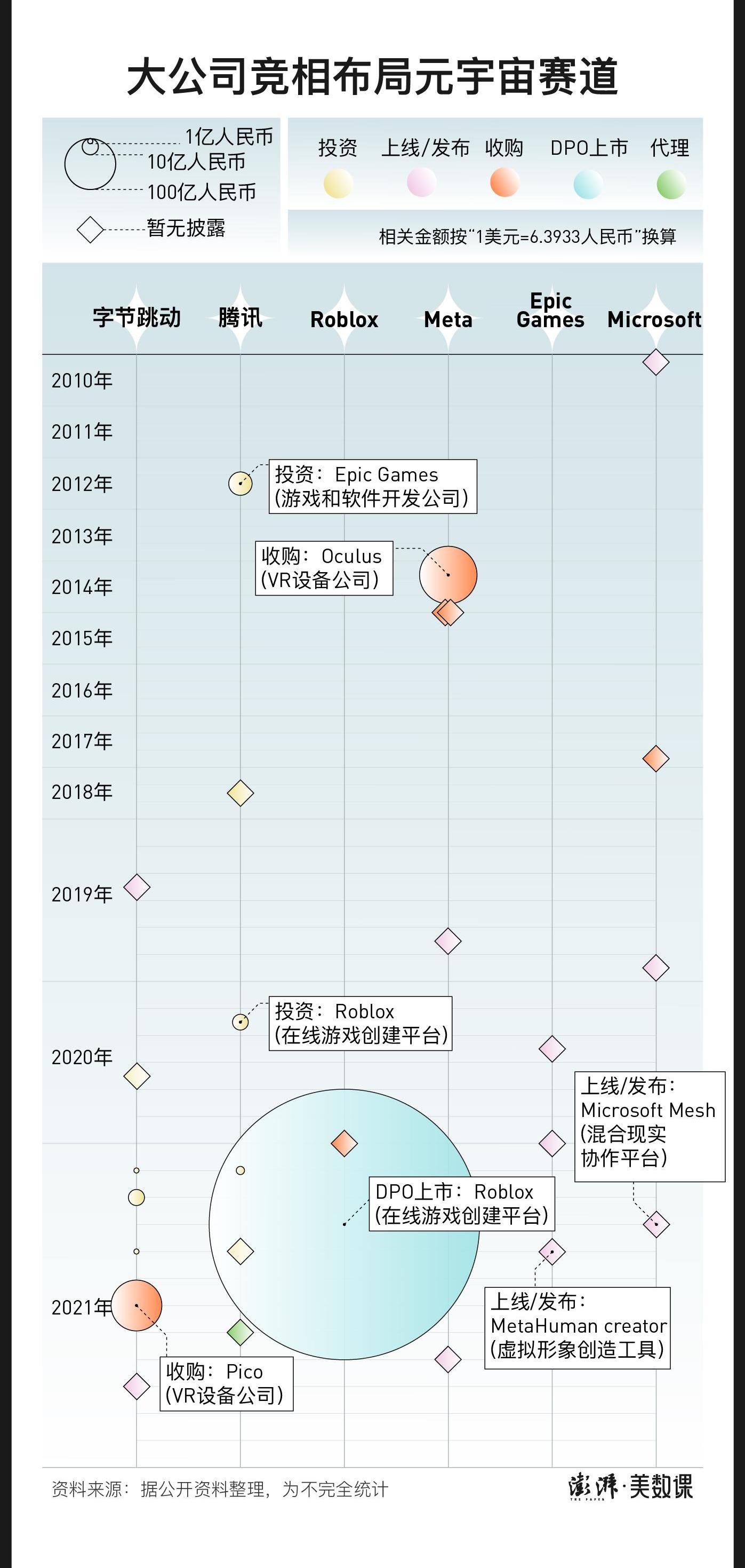 澎湃新闻挑选了字节跳动、腾讯、Roblox、Meta、EpicGames、Microsoft6家中美公司,盘点其在元宇宙赛道方面的投资、收购和开发等行为。虽然是不完全统计,但仍可发现,从2021年开始,各家企业元宇宙布局明显提速。
