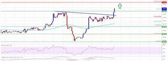 在ETH/USD的小时图上突破了关键的看跌趋势线,阻力位在1,655美元附近。