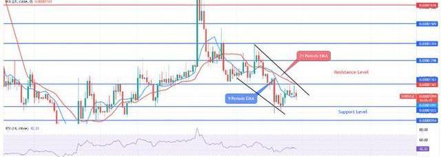 价格在两个EMA下方交易,这是看跌走势的迹象。快速移动平均线已经越过了缓慢的移动平均线下行。卖方势头的增加可能会跌破0.000010美元、0.000009美元的水平,并且可能会测试0.000008美元的支撑位。如果买家捍卫0.000010美元的支撑位,价格可能会反转并向上突破0.000011美元,可能会达到0.000012美元和0.000013美元。然而,相对强度指数周期14处于42个指向下行的水平以指示卖出信号。