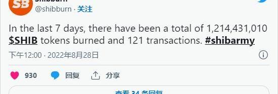 ShibaInu爱好者通过在过去24小时内燃烧5730万个ShibaInu(SHIB)代币,每周燃烧12.1亿个,进一步减少了最受欢迎的以犬类为主题的加密货币的流通供应。