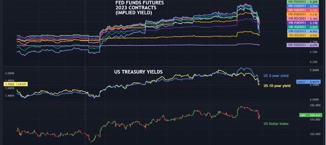 工资增长疲软是令人鼓舞的,但这一指标一直非常不稳定,近几个月来频繁修正,这表明它作为一个转折信号或作为劳动力市场紧张程度的指标可能并不可靠。那么,为什么在仅仅两天里,市场对对FOMC终端利率预期从5.70%急剧下调至5.28%呢?