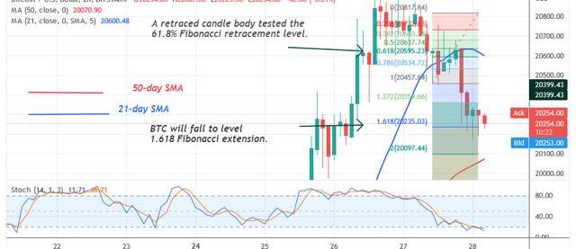 同时,随着BTC价格停在20.2美元以上,比特币已回落至超卖区域。在27月61.8日的下行趋势中,BTC价格向上修正,一根蜡烛体测试了1.618%的斐波那契回撤位。修正意味着BTC将跌至20,235.03斐波那契扩展水平或XNUMX美元。