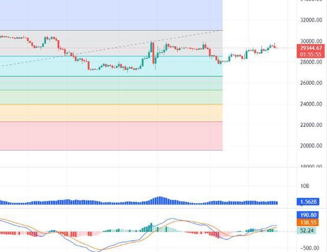 日线级别上,目前依然还是一个多头的结构之中,K线逐步上移,抬高币价,均线也形成一个粘合后的上攻姿态。技术指标上,MACD的双线零上金叉预期也即将成型,日线上的行情还是足够支持进一步反弹的。目前的话,向上反弹目标有点不好预判,如果前期的31000能够快速突破的话,在多头的市场带动效应下,还是值得期待的一轮趋势行情。毕竟现在的市场说到底,就是情绪化加资金了,其实本身就没有基本面,全部是靠消息和情绪驱动,之前的银行暴雷,然后和科技股财报利好,现在又是延后衰退,妥妥的都是利好情绪面,所以上涨并不难。而现在的情况是,市场资金还没有完全的行动起来。