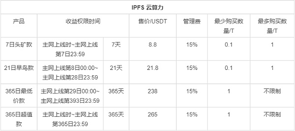 为满足用户不同投资需求,HyperPay IPFS云算力上架4款云算力产品,收益权限时间不同,价格不同,详情如下: