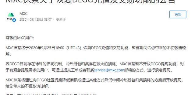DEGO在前几天上线抹茶的时候就出现了问题,先是延期上线,后来上线后改成了只能充值交易、不能提币,紧急提币要联系抹茶官方邮箱。也就是说,用户充进去的DEGO全都进了冷钱包。