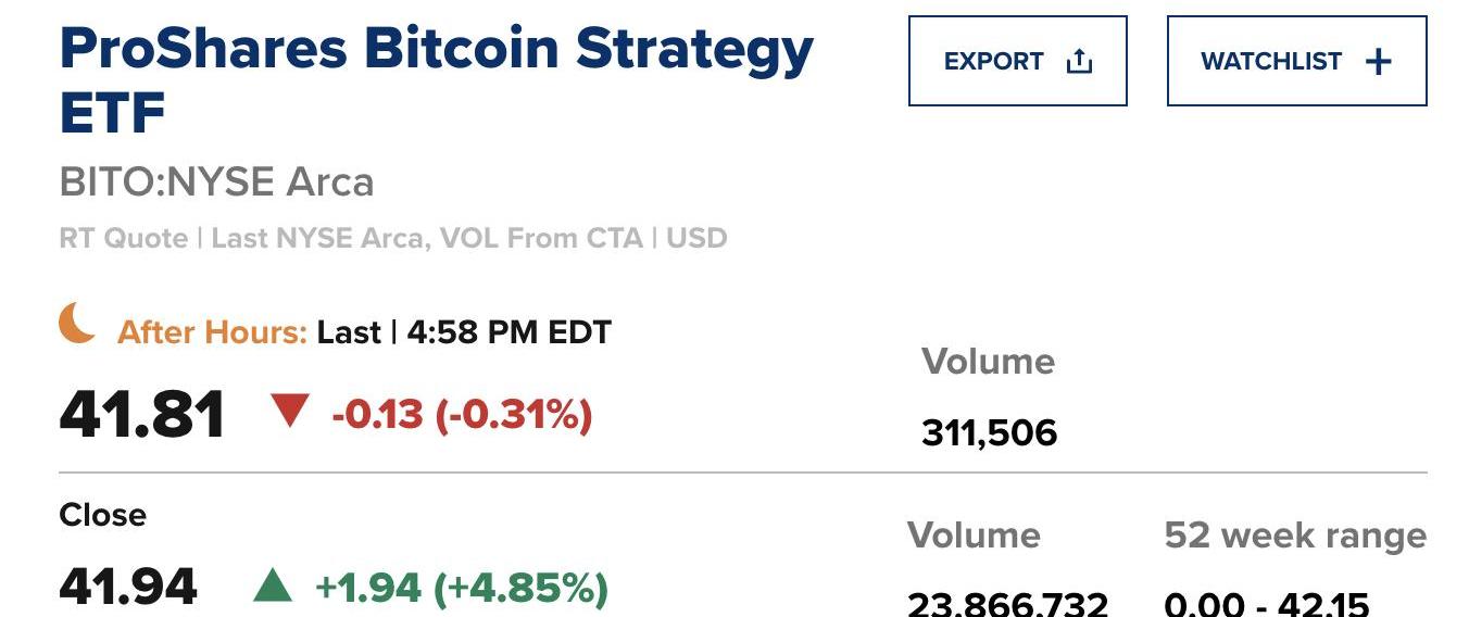 CNBC数据显示,截至美国东部时间下午4:02,即美国股市收盘后不久,BITO交易量达到近2390万股,根据收盘价计算价值超过10亿美元。BITO价格在收盘时上涨至41.94美元,日涨幅4.85%。