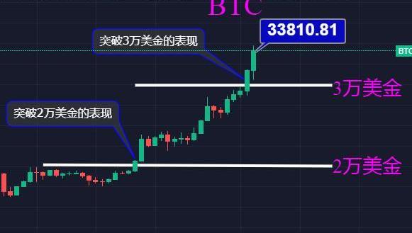 所有的币种在价格突破整数个的时候上涨或下跌都具有相似性。就拿比特币来说,当比特币突破2万美金的时候,连续迎来了两天的强势上涨,突破比特币的第二天,又是迎来了一波上涨,最高达到23500美金;而到了3万美金的时候,今天又迎来了一波34762美金的上涨,我们要做的就是持有,这就是一个最高老的投机法则,你可以观察所有山寨币价格超过100美金以上的币种,此种方法都适用。