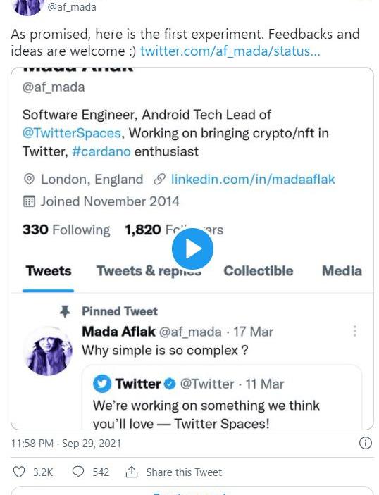 Twitter正在开发一个标签,展示用户的NFT收藏,该平台于9月首次开始开发该功能。来自Twitter软件工程师MadaAflak的一条推文在9月下旬首次展示了其实验的早期阶段。