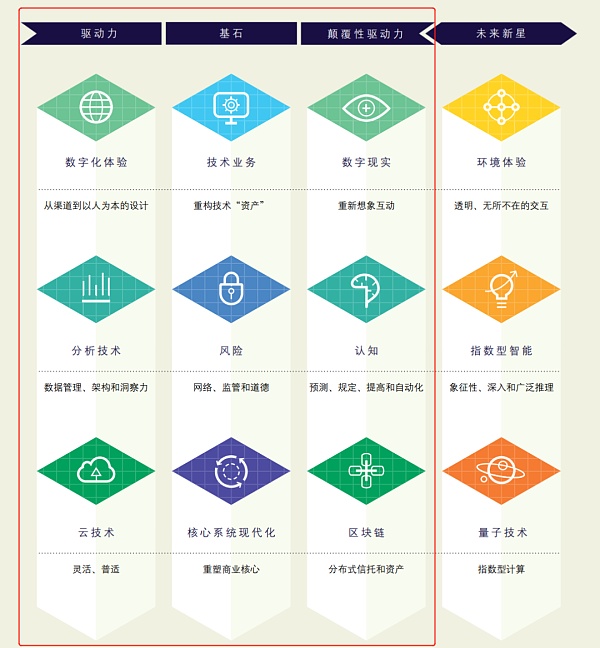 未来的十年中,数字现实、认知技术和区块链将成为企业变革的颠覆性驱动力。它们的应用范围将越来越广,各行各业的案例成倍增加。数字技术、技术风险和核心系统数字化是驱动企业变革和创新的基础技术。