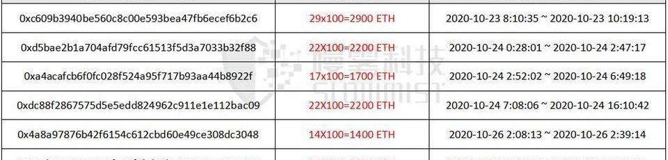 如表2结果所述,黑客在2020-10-2316:06:28~2020-10-2610:32:24(UTC)间,以每次100ETH,存115次的方式将11,500ETH存入Tornado.Cash。为了方便说明,我们只截取了该地址在2020-10-243:00:07~6:28:33(UTC)间的存款记录,如下图: