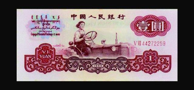 第三套人民币一元券为“60版”,于1969年开始发行流通。一元券票面主图呈深红色,正面为“女拖拉机驾驶员”图,象征国家经济“以农业为基础”。一元券背面图案为牧羊图,象征发展畜牧业。此套人民币在背面印有藏、蒙、维、壮四种少数民族文字,具有鲜明的民族特色。