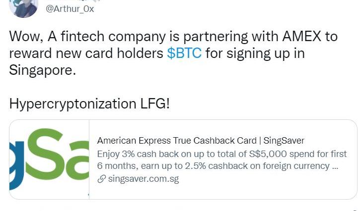 巴比特讯,9月16日,据加密投资者Arthur_0推特消息,新加坡金融科技公司Singsaver正与美国运通公司合作,为在新加坡注册的信用卡持有人奖励BTC。根据官网页面显示,对于新注册的用户,将奖励365新元的比特币,条件是必须在信用卡获批后30天内消费500新元,此外,前2000名申请者将获赠额外价值100新元的比特币奖金。此外,对于现有用户,将奖励50新元的比特币,条件同上。前2000名申请者将获赠价值50新元的比特币奖金。