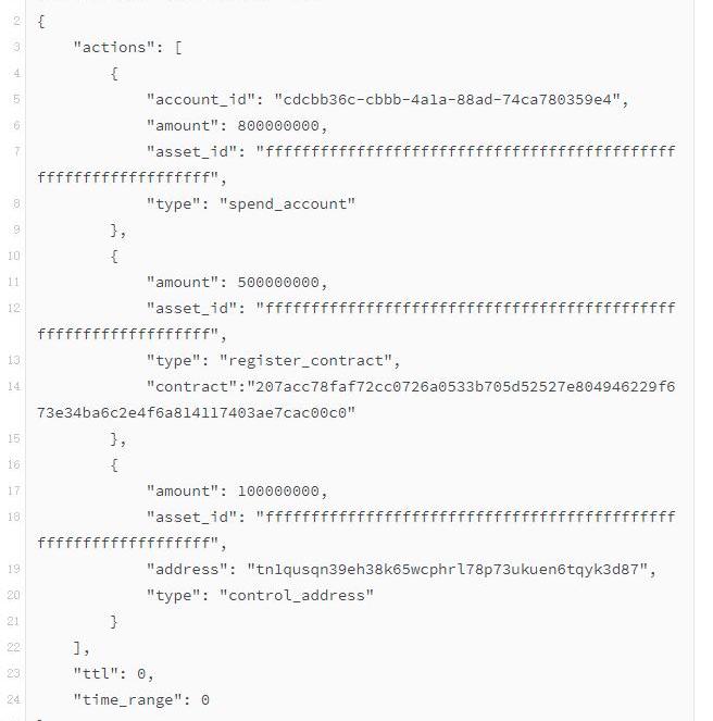 构建注册合约的交易结构,其中type为"register_contract",同时将本地创建的合约id带入contract中