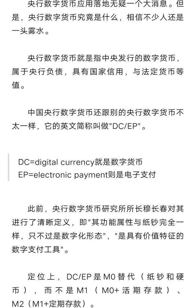 记住这一点:央行数字货币替代M0,其功能和属性与纸币相似,只不过形态是数字化的。