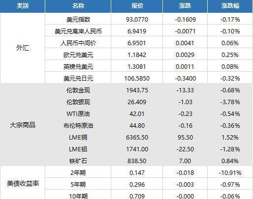 商品收盘方面,COMEX12月黄金期货收跌1.05%,报1949.80美元/盎司,本周累跌约3.9%,为6月5日以来首次单周下跌。WTI9月原油期货下跌0.23美元,收于每桶42.01美元,跌幅为0.54%。布伦特10月原油期货下跌0.16美元,收于每桶44.80美元,跌幅为0.36%。