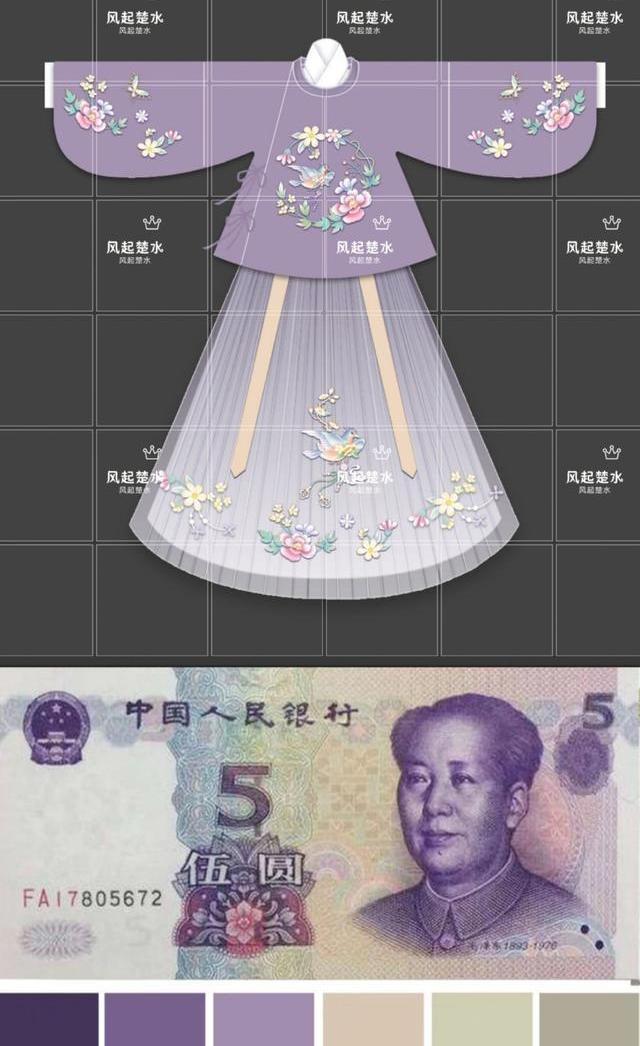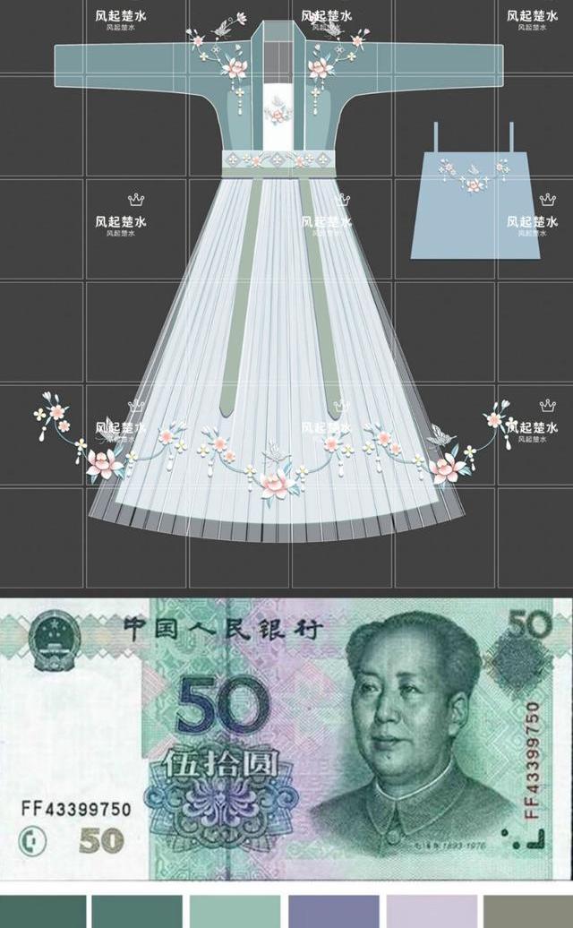 这样的设计其实也是很大程度上降低了“翻车率”,很多“翻车”的汉服往往都是因为配色过于古怪,所以不受到大众的喜爱。而人民币配色饱和度比较低,适合的人群比较广,运用的都是相近的颜色,更适合夏季的清爽感。