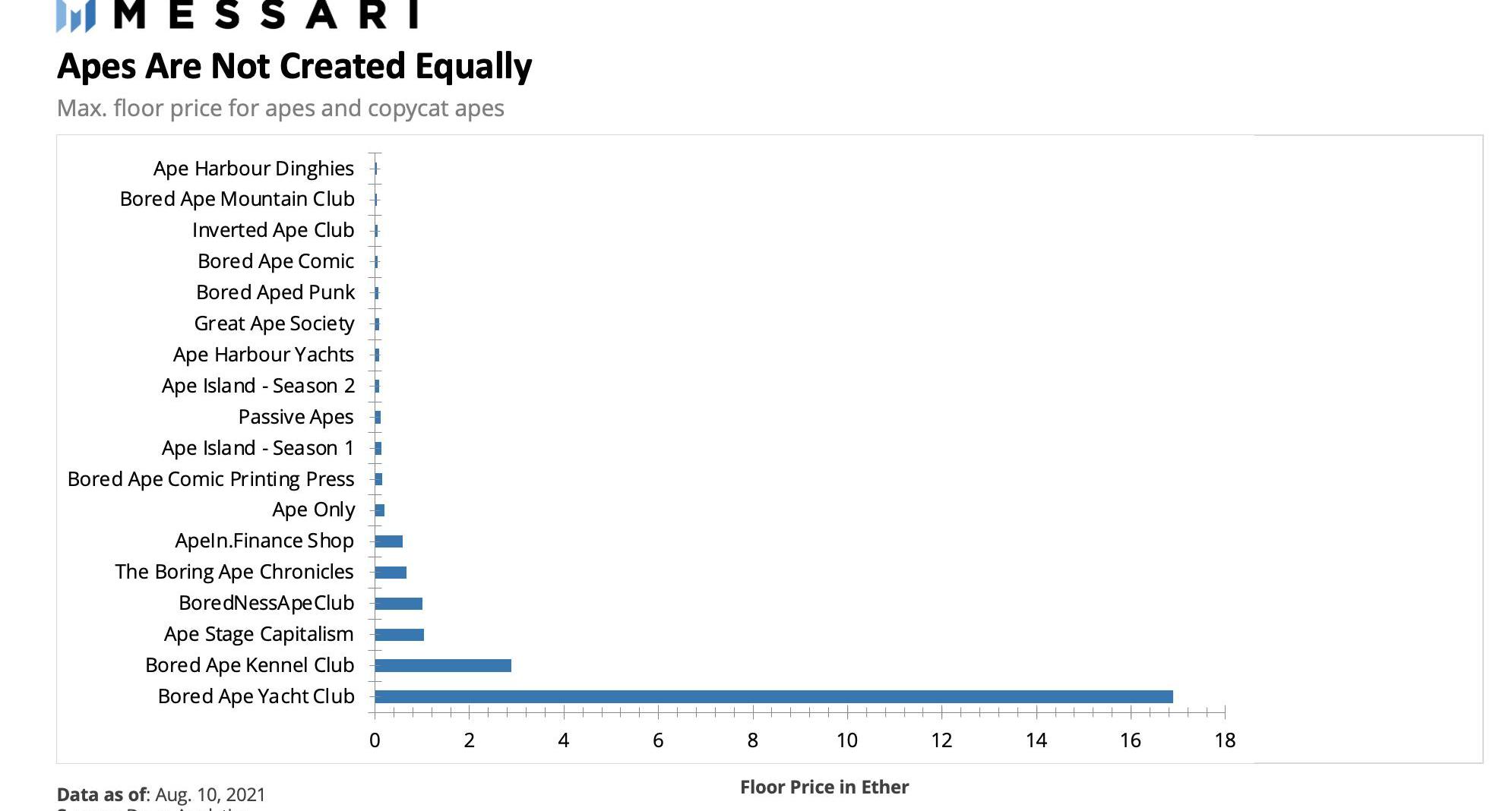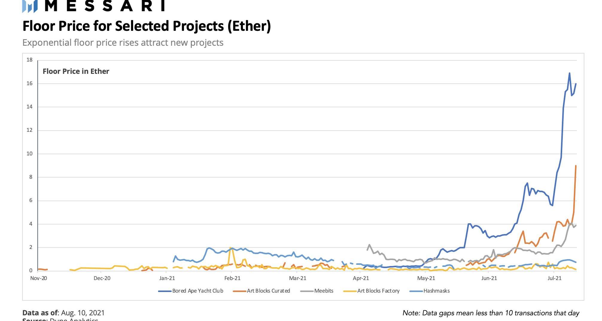 显然,猿猴、企鹅、山羊和其他各种动物新项目的爆发是泡沫迹象。但是,在评估某个NFT藏品集合,分析某些NFT与整个收藏品集合相比是被低估还是被高估时,地板价可能是一个有用的衡量标准。
