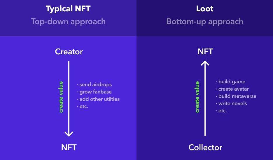 在短视频爆火的数年前就投身于这一领域的经历让人们对于DomHofmann如今推出的Loot无比期待,大量社区成员们已经开始期待着Loot对NFT领域的颠覆。其中最彻底的颠覆就是将当前NFT自上而下发展的路线调转为自下而上,这种范式的转变让如今NFT领域疯狂的投资者们大受震撼。