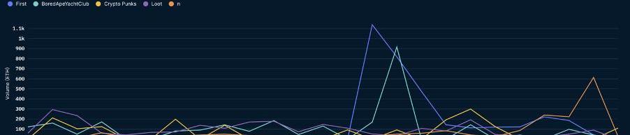 截止今日14:00,根据Nansen的数据,按照交易量排列,本日Top5的NFT项目为First、BAYC、CryptoPunks、Loot以及n。