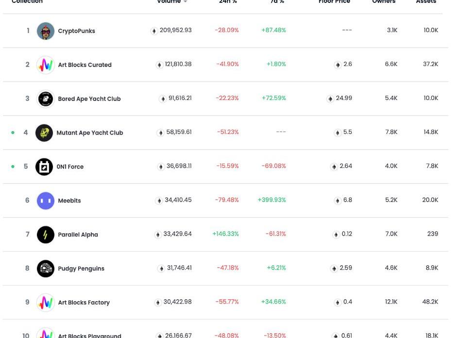 Opensea上的排名显示,过去三十天在前十名总交易量最大的项目里,ArtBlocks占据了三个位置,其中ArtBlocksCurated仅次于Cryptopunks,排名第二。