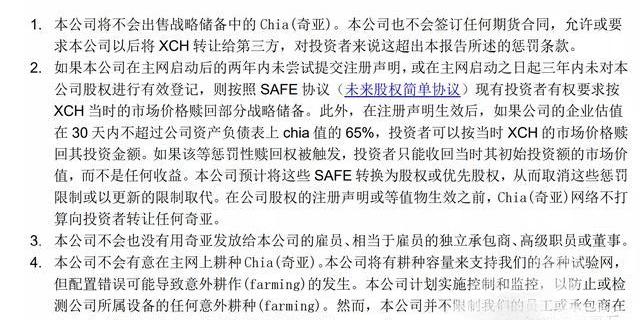 Chia商业白皮书中披露“自成立以来,公司已经通过SAFE协议筹集了约1600万美元资金。这些资金主要分三轮,有三种不同标准的价格上限,和转换功能。最后一轮500万美元的融资已于2020年8月完成。没有向任何投资者被承诺以chia作为投资回报。某些投资者拥有赎回权,如果公司在上述特定时间段内未将股权上市公开交易,则将以Chia(奇亚)币的当时价格计价。本公司预计将这些SAFEs转换为股权或优先股权,并且不打算在本公司股权注册声明生效前向投资者提供XCH。”
