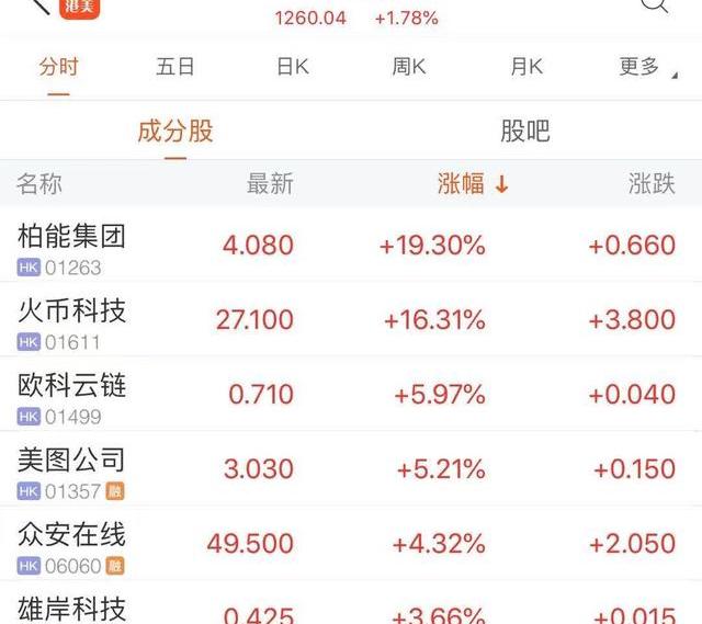 比特币火爆致港股区块链概念股全线走高,截至收盘,柏能集团涨19.3%,火币科技涨16.31%,美图公司涨5.21%。