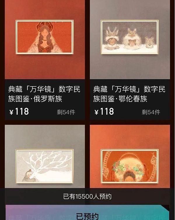 8月20日,腾讯旗下的NFT交易App「幻核」启动了第二期数字艺术品发售活动,此次公开售卖的藏品是名为「『万华镜』数字民族图鉴」的绘画NFT,整套作品以中华56个民族为主题,每个民族图鉴限量售卖54件,售价均为118元。1分钟内,3024件数字收藏品被抢购一空。