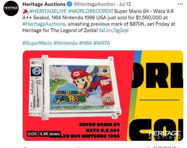 上周日,德克萨斯州的一场拍卖会上,一盘未拆封的1996年《超级马里奥64》拍出天价,以156万美元卖出。