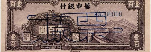 华中银行成立于1945年8月,华中银行由原来在抗日战争时期华中各个抗日根据地设立的地区性银行、银号合并而成。包括苏北行署区的盐阜银行、苏中行署区的江淮银行、江南地区的江南银行、淮北行署区的淮北地方银号、淮南行署区的淮南银行、皖中行署区的大江银行、浙东行署区的浙东银行以及早期淮海行署区的淮海银行。华中银行首任行长陈穆、副行长徐雪寒。华中银行共发行过5角、1元、2元、5元、10元、20元、50元、100元、200元、500元、1000元、2000元5000元共计13种面额钞票,还发行过本票。1945年版黄布纹纸5元券正面主图案为战士吹号和长城图案;