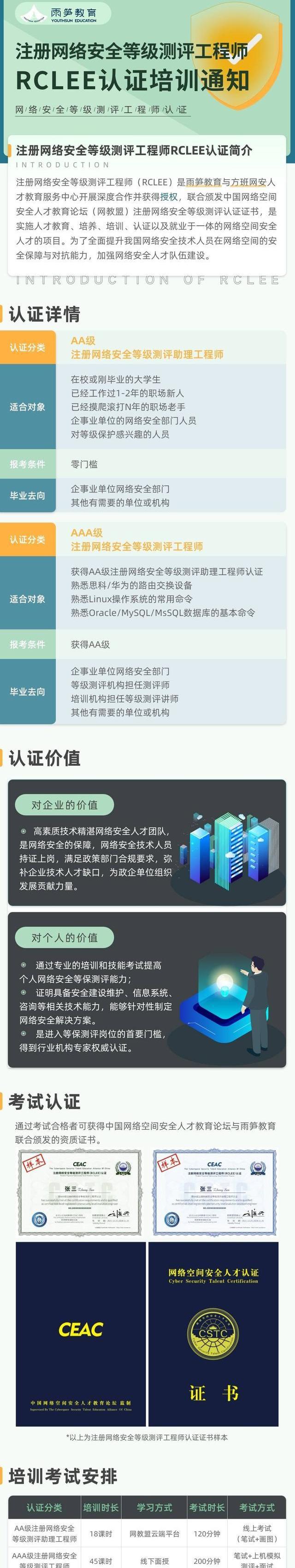 网络安全人才供需的严重失衡,不仅体现在数量上,部分企业“重产品轻服务、重管理轻技术”的现象也普遍存在。为了进一步落实网络安全人才培养和认证工作,《注册网络安全等级测评工程师》认证证书应运而生,它是雨笋教育与网教盟共同开发可行性人才认证的有效证书之一,填补了网络安全行业等保测评证书认证培训的空白。