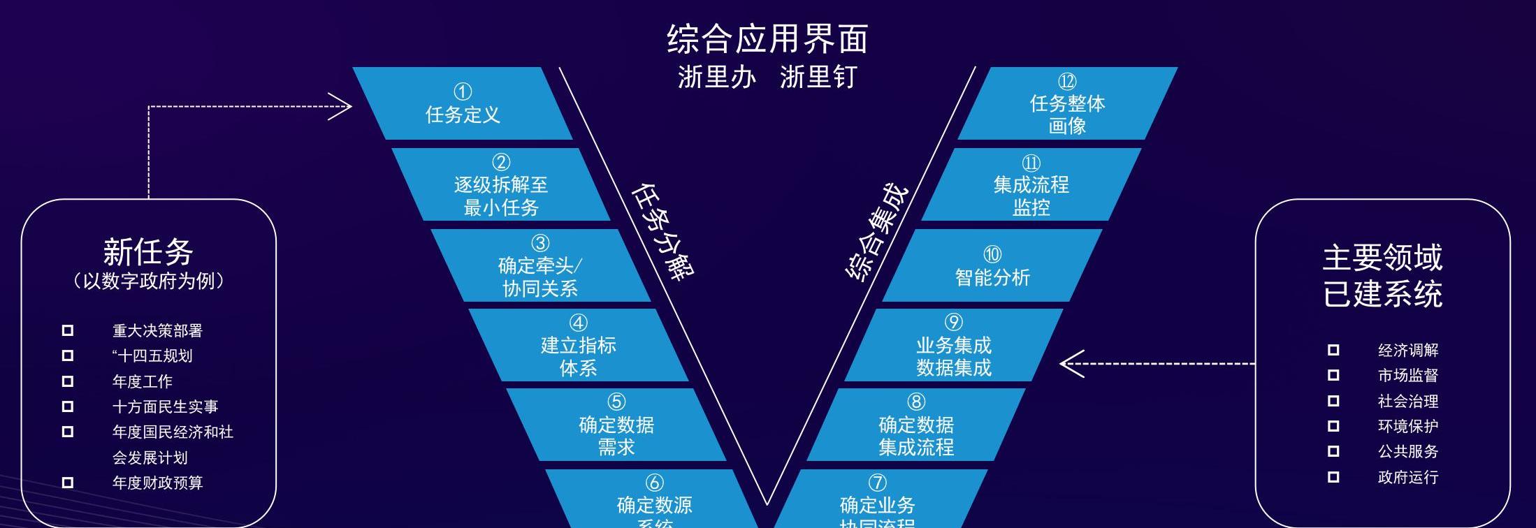 数字化改革很重要的一点是理论方法,我们称之为“V字型理论”。从效果的角度对业务进行拆解和区分,“V”的左边是对每一个市场需求的细分和分解,右端针对每一个细分环节进行相应的解决方案和组合,进而构成一整套的系统。为什么是“V”而不是环型?“V”左右每一步可以互相对应,与软件行业著名的“VV模型”异曲同工。简单来说,我们在对待具体需求和业务的时候,应该用“V”字的方式,确保最后的解决方案能够解决客户的痛点。