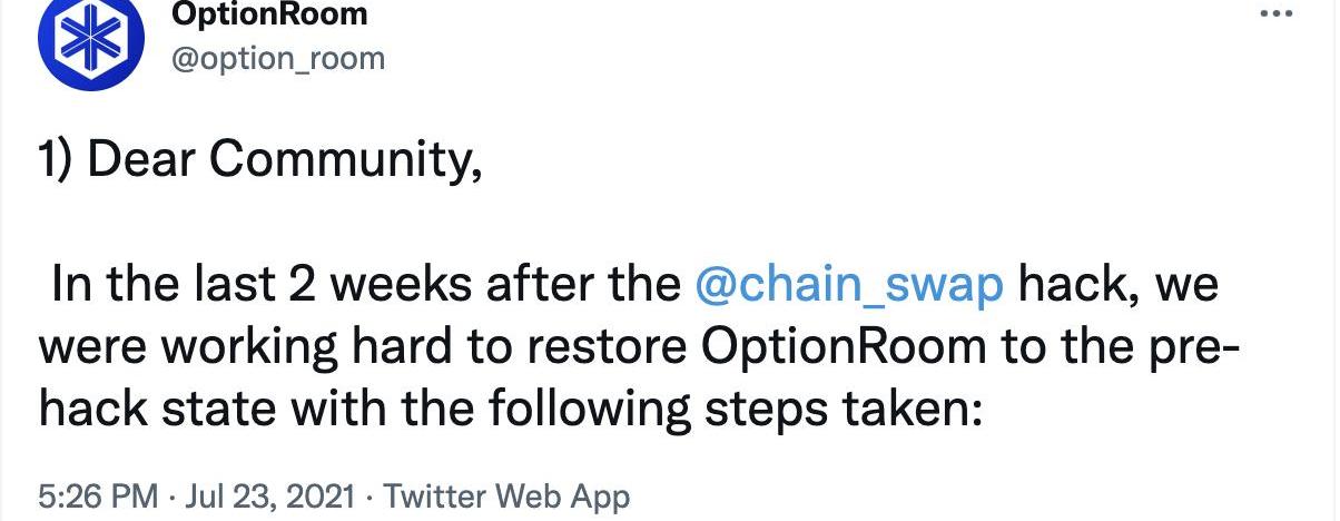巴比特讯,波卡生态预言机和预测协议OptionRoom在推特上发布有关“将OptionRoom恢复至ChainSwap攻击事件之前状态”的最新进展:1.已对所有智能合约进行审计并增加安全措施,确保在意外情况下迅速恢复;2.已对黑客攻击前每个地址的代币持有量进行计算,并在BSC上空投;3.已对智能合约进行了分析,计算每个用户在所有合约中的存款;4.存入智能合约的代币被将反映到新部署的合约中;5.将向流动性供应者将空投PancakeLP代币,COURT和LP代币将在当天结束前发出;6.旧市场必须被禁用,正在准备一个UI,以允许用户赎回他们的参与代币,并提取提供的流动性;7.新的市场合约已经部署,将在48小时内启动并运行;8.BSC上新的ROOM代币地址为:0x3C45A24d36Ab6fc1925533C1F57bC7e1b6fbA8a4,已通知CMC和CoinGecko尽快更新数据。