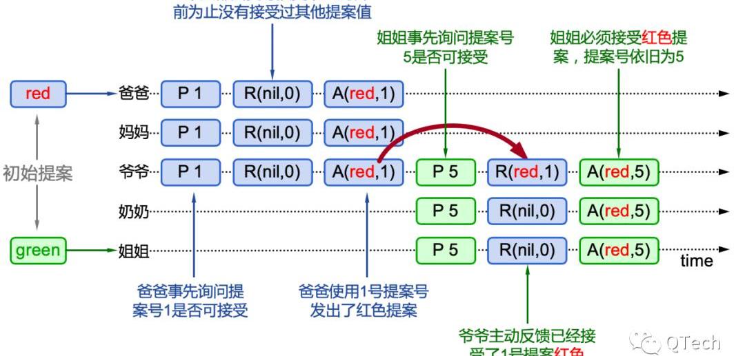 通过上面的问题,我们发现,为了防止整个决策进入到一种无法终止的状态,我们还需要通过某种方式对提案进行排序,从而拒绝一些旧的、无效的提案,并及时地向提案者反馈自己接受的提案值,避免提案者一直发起相同的提案。也就是说,如果爷爷在收到爸爸的延迟提案时,能够知道先前已经存在一个更新的提案并拒绝旧提案,同时告知爸爸已经接受了姐姐的绿色提案的话,就可以避免出现多种提案达到选定状态的困境。