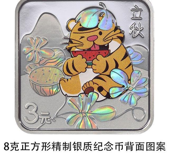 8克正方形银质纪念币背面图案以虎、西瓜、瓜秧为主要设计元素,展现立秋时节吃瓜“咬秋”习俗,并刊“立秋”字样及面额。