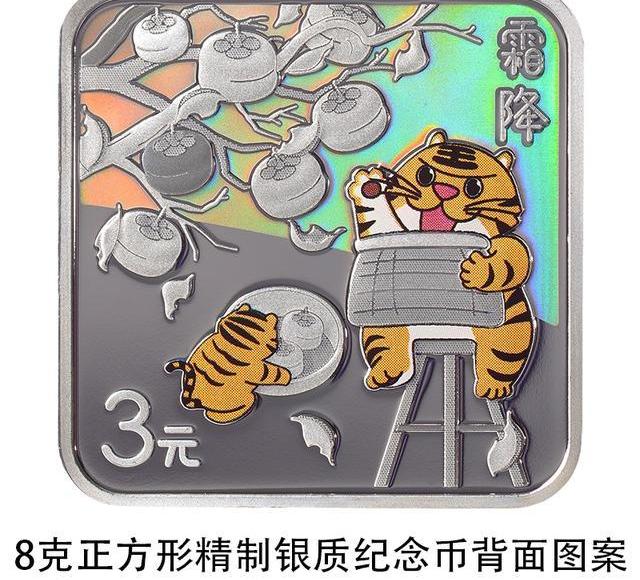 8克正方形银质纪念币背面图案以虎、柿树为主要设计元素,展现霜降时节采摘柿子情景,并刊“霜降”字样及面额。