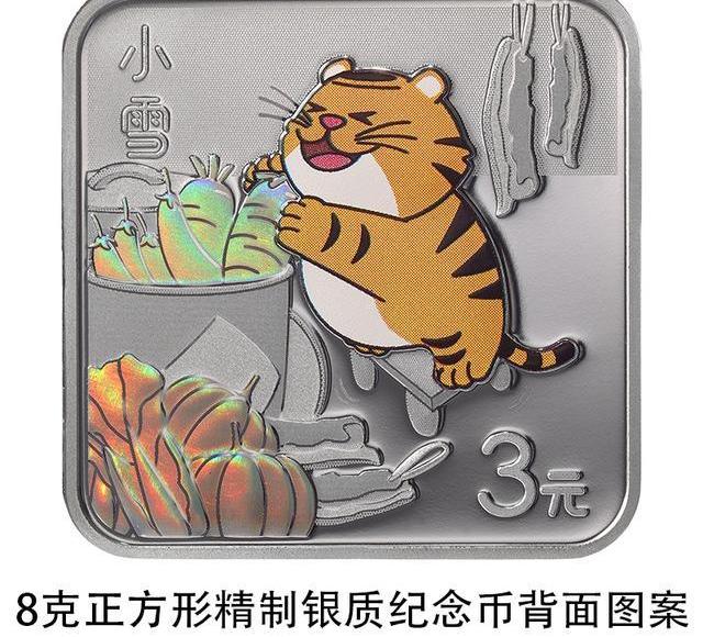 8克正方形银质纪念币背面图案以虎、蔬菜、腊肉为主要设计元素,展现小雪时节“腌菜”“制腊肉”习俗,并刊“小雪”字样及面额。