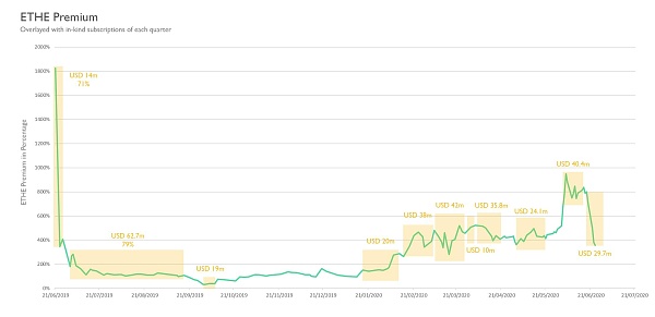 目前ETHE的溢价率已经从6月初的950%大幅下降到6月24日的350%。Messari报告还预测,到2020年底,当更多可自由交易的份额释放后,ETHE的溢价率还将大幅下降。