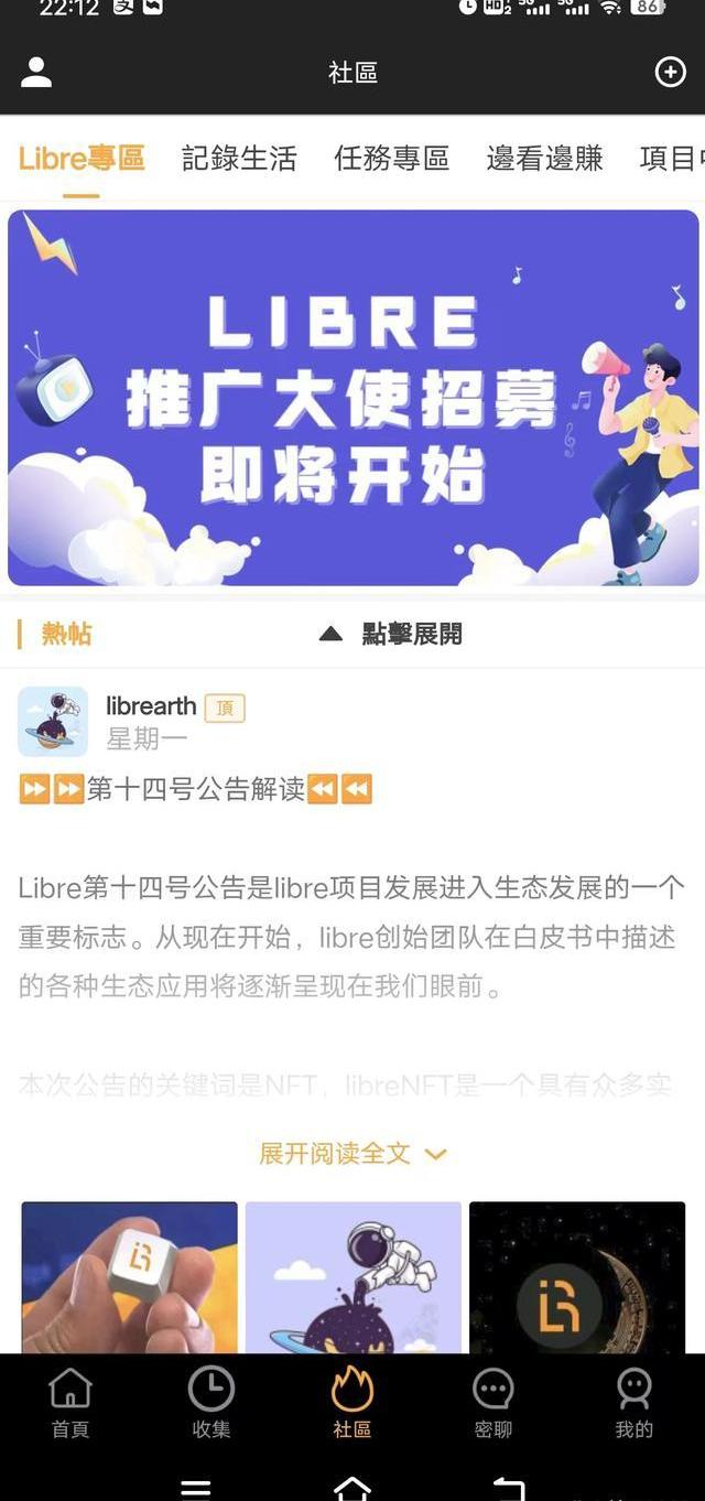 11、官方发布的Libre力波NFT均为免费,但是需要完成任务才能获得,目前Libre的NFT交易市场已经开放,支持力波币及RM币交易,RM币收付款通过支付宝实现,Libre官方收取成交价5%的手续费。