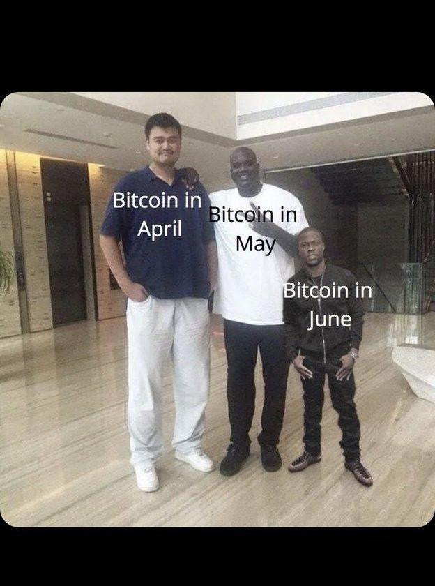 最有趣的应该是下面这个图,其中用姚明、奥尼尔和凯文·哈特的身高来凸显比特币在四月、五月和六月的价格走势。额……从凯文·哈特的身高来看,六月份的下跌幅度有点大……