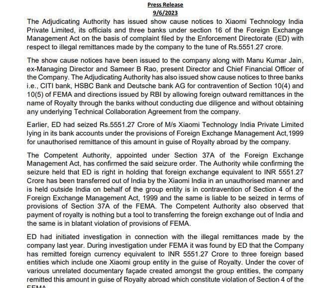 印度执法局6月9日正式发布文件称,因小米涉嫌违反该国《外汇管理法》,「向外国实体非法转移资金」,该局已经向小米技术印度私人有限公司、小米印度分公司、部分高管及花旗等三家银行发出正式通知。