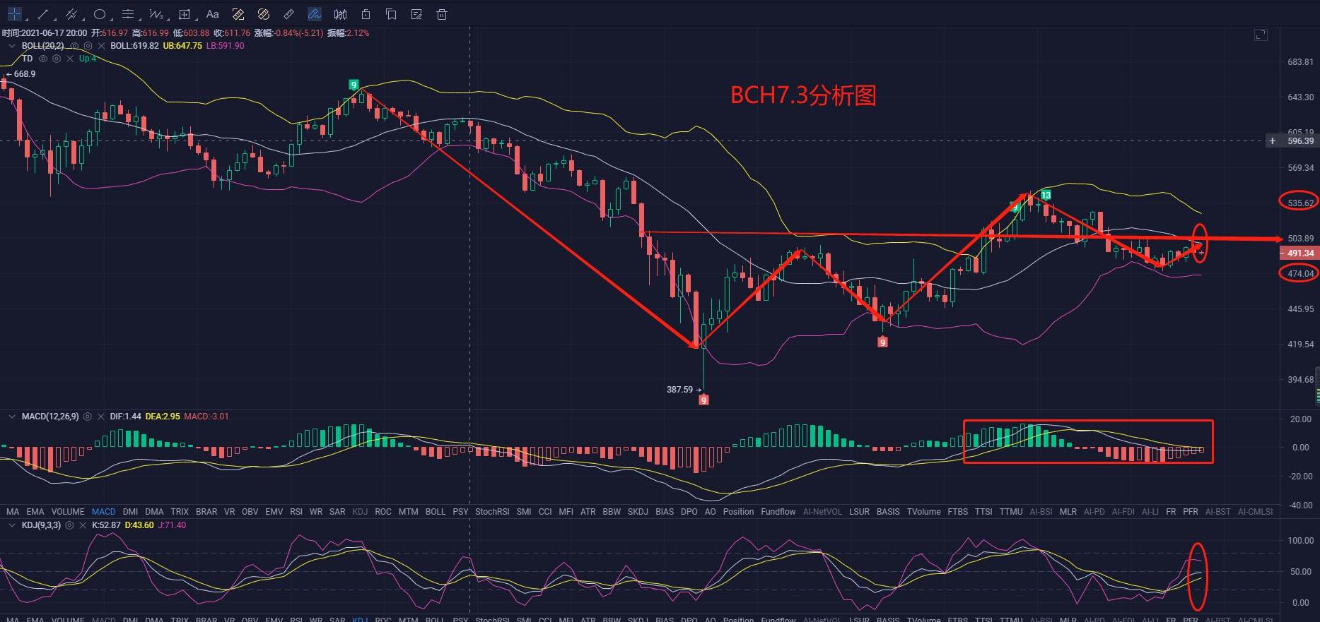 太子昨日至今的走势还算比较理想,缓慢的走出震荡上行趋势,今日最高在冲击498一线后,未能有效突破500一关,再一次的进入了回调区间。当下从技术面来看,四小时线上K线处于布林带中轨处徘徊,走出阴K十字光标形态,空头方面上仍存在着一定量能压制着币价上涨,MACD呈死叉形态,KDJ出现高位持平趋势,则当下需关注本轮K线是否能有效企稳中轨线处,如若企稳当前价格,行情则会再次走出攀升局面,如若未能企稳,则会出现下行趋势。本日思路以高空为主,低多为辅,下方支撑暂看450一线,上方压力看550一线不变。现货:现持有450以下的现货,长线继续持有保持不动。区间建议:价格突破495附近多,目标看500-510-530-550附近。价格跌破490附近空,目标看480-470-450-430附近。上下止损点位设置在5-10点左右即可以上内容均为个人观点,仅供参考!市场行情瞬息万变,文章有一定的滞后性,具体以实盘走势为主!???????????????????????????