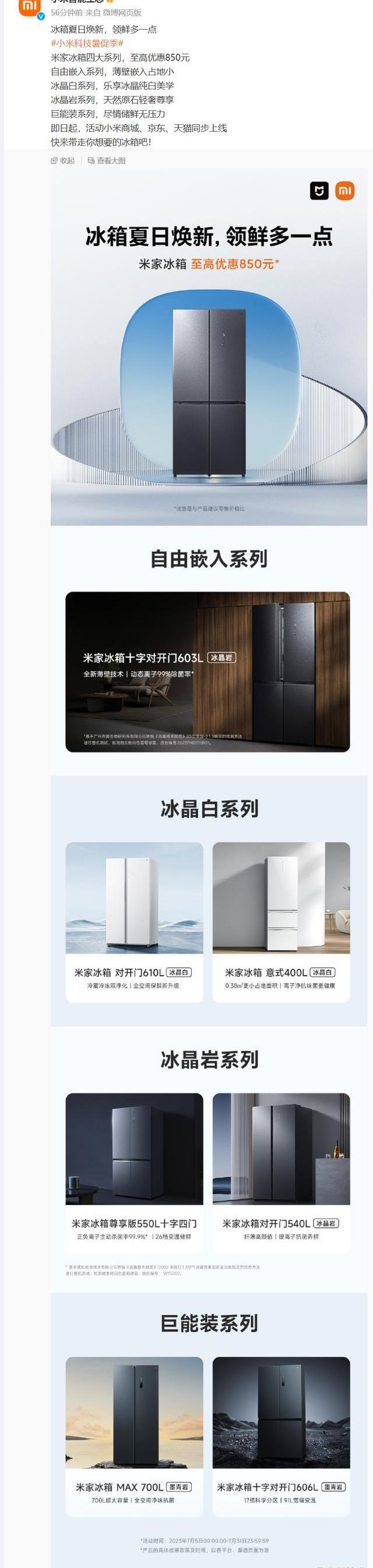 小米智能生态宣布,米家冰箱四大系列:自由嵌入系列、冰晶白系列、冰晶岩系列、巨能装系列至高优惠850元,活动截至7月31日,活动会场点此进入。