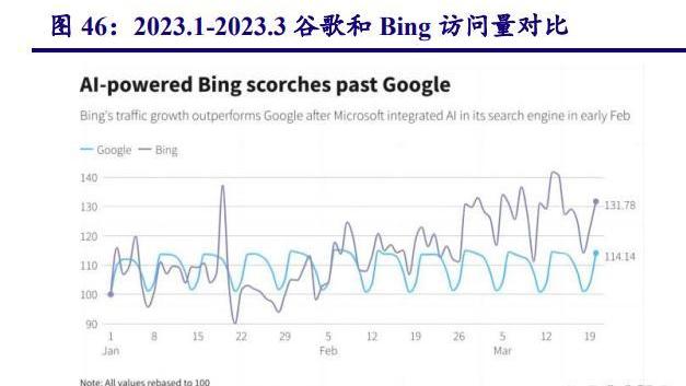微软的Bing嵌入GPT-4,彻底颠覆了传统搜索引擎的信息获取方式。目前BingDAU超过1亿,且据Similarweb数据显示,自2023年2月7日NewBing上线后,Bing访问量激增15.8%,而谷歌访问量则降低近1%。NewBing带来的巨大流量为广告商创造了机会,据微软首席营销官YusufMehdi表示,微软已于3月开始与合作伙伴就如何利用NewBing提供的分发方式增加收入进行讨论。使用中发现,NewBing会根据问题推荐链接,用户可点击链接轻松跳转至其他网页,这或将成为NewBing广告引流重要途径。